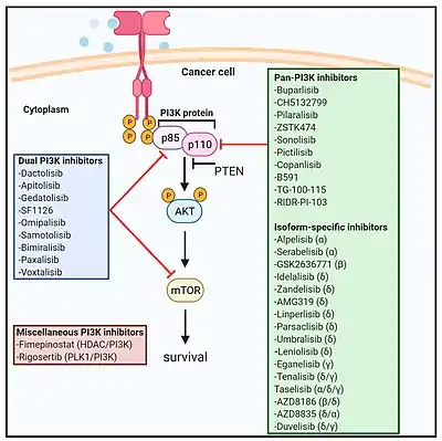 Phosphoinositide 3-kinase inhibitors (PI3K inhibitors) are a class of medical drugs that are mainly used to treat advanced cancers. They function by inhibiting one or more of the phosphoinositide 3-kinase (PI3K) enzymes, which are part of the PI3K/AKT/mTOR pathway. This signal pathway regulates cellular functions such as growth and survival. It is strictly regulated in healthy cells, but is always active in many cancer cells, allowing the cancer cells to better survive and multiply. PI3K inhibitors block the PI3K/AKT/mTOR pathway and thus slow down cancer growth.[2][3] They are examples of a targeted therapy.[4] While PI3K inhibitors are an effective treatment, they can have very severe side effects and are therefore only used if other treatments have failed or are not suitable.[5][6]