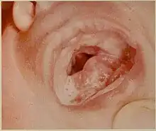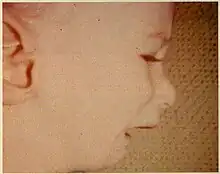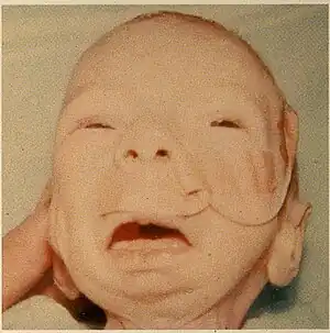 Pierre Robin sequence[lower-alpha 1] (/pjɛər rɔːˈbæ̃/;[3] abbreviated PRS) is a congenital defect observed in humans which is characterized by facial abnormalities. The three main features are micrognathia (abnormally small mandible), which causes glossoptosis (downwardly displaced or retracted tongue), which in turn causes breathing problems due to obstruction of the upper airway. A wide, U-shaped cleft palate is commonly also present. PRS is not merely a syndrome, but rather it is a sequence—a series of specific developmental malformations which can be attributed to a single cause.[4]