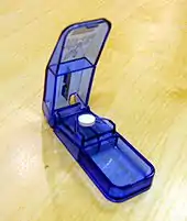 A pill-splitter is a simple and inexpensive device to split medicinal pills or tablets, comprising some means of holding the tablet in place, a blade, and usually a compartment in which to store the unused part. The tablet is positioned, and the blade pressed down to split it. With care it is often possible to cut a tablet into quarters. Also available as consumer items are multiple pill splitters, which cut numerous round or oblong pills in one operation.