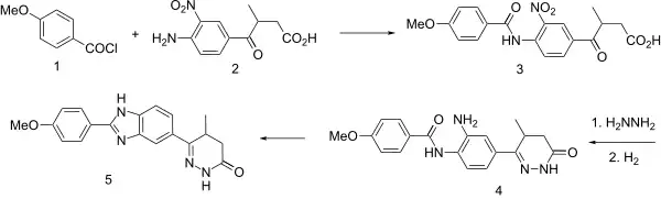 The reaction between p-anisoyl chloride [100-07-2] (1) and CID:20516917 (2) gives 4-[4-[(4-Methoxybenzoyl)amino]-3-nitrophenyl]-3-methyl-4-oxobutanoic acid, CID:20516902 (3). The reaction of this with hydrazine gives 5-methyl-6-[3-nitro-4-(4-methoxy-benzoylamino)-phenyl]-3-oxo-4,5-dihydro-2H-pyridazine [74149-73-8]. Catalytic hydrogenation reduces the nitro group giving [74149-74-9] (4). cyclization of the resulting ortho amino amide by means of a strong acid leads to the formation of the corresponding benzimidazole. There is thus obtained pimobendan (5).