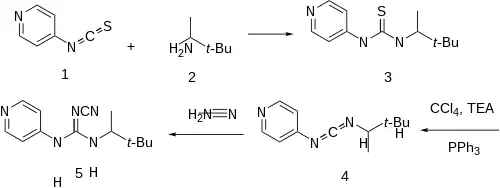 - Hansen, E. T.; Petersen, H. J. (2006). "Synthesis ofN-Alkyl-N'-cyano-N″-4-pyridylguanidines from 4-Pyridyldithiocarbamic AcidviaN-Alkyl-N′-4-Pyridylthioureas, orvia4-Pyridylcyaniminothiocarbamic Acid". Synthetic Communications. 14 (13): 1275–1283. doi:10.1080/00397918408076809.