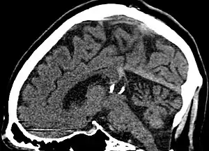 | Calcified cyst of pineal gland in CT. Sagittal MPR. |