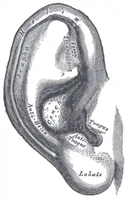 The auricle or auricula is the visible part of the ear that is outside the head. It is also called the pinna (Latin for "wing" or "fin", plural pinnae), a term that is used more in zoology.