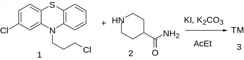 The alkylation of 2-chloro-10-(3-chloropropyl)phenothiazine [2765-59-5] (1) with Isonipecotamide [39546-32-2] (2) gives pipamazine (3).