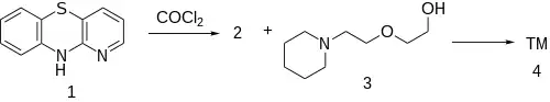 The reaction of 1-azaphenothiazine [261-96-1] (1) with phosgene gives 1-azaphenothiazine-10-carbonyl chloride [94231-78-4] (2). The reaction of this reactive intermediate with 2-[2-(piperidyl)ethoxy]ethanol [3603-43-8] (3) gives the ester, thus completing the synthesis of Pipazethate (4).