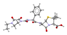 Piperacillin is a broad-spectrum β-lactam antibiotic of the ureidopenicillin class.[1] The chemical structure of piperacillin and other ureidopenicillins incorporates a polar side chain that enhances penetration into Gram-negative bacteria and reduces susceptibility to cleavage by Gram-negative beta lactamase enzymes. These properties confer activity against the important hospital pathogen Pseudomonas aeruginosa. Thus piperacillin is sometimes referred to as an "anti-pseudomonal penicillin".