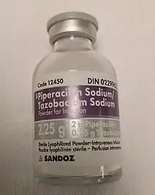 It was patented in 1974 and approved for medical use in 1981.[3] Piperacillin is most commonly used in combination with the beta-lactamase inhibitor tazobactam (piperacillin/tazobactam), which enhances piperacillin's effectiveness by inhibiting many beta lactamases to which it is susceptible. However, the co-administration of tazobactam does not confer activity against MRSA, as penicillin (and most other beta lactams) do not avidly bind to the penicillin-binding proteins of this pathogen.[4] The World Health Organization classifies piperacillin as critically important for human medicine.[5]