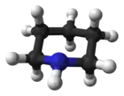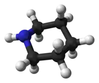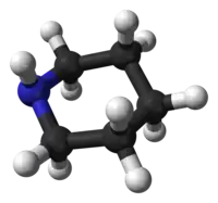 Piperidine is an organic compound with the molecular formula (CH2)5NH. This heterocyclic amine consists of a six-membered ring containing five methylene bridges (–CH2–) and one amine bridge (–NH–). It is a colorless liquid with an odor described as objectionable, and typical of amines.[6] The name comes from the genus name Piper, which is the Latin word for pepper.[7] Although piperidine is a common organic compound, it is best known as a representative structure element within many pharmaceuticals and alkaloids, such as natural-occurring solenopsins.[8]
