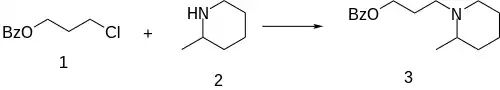 Alkylation between 3-chloropropyl benzoate [942-95-0] (1) and Pipicoline [109-05-7] (2) provides piperocaine (3).