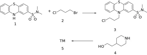 The alkylation of 2-Dimethylaminosulfonylphenthiazine [1090-78-4] (1) with 1-Bromo-3-chloropropane (2) gives 10-(3-chloropropyl)-N,N-dimethylphenothiazine-2-sulfonamide [40051-12-5] (3). Alkylation with 4-Piperidineethanol [622-26-4] (4) completes the synthesis of Pipothiazine (5).