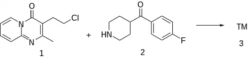 The alkylation between 3-(2-chloroethyl)-2-methylpyrido[1,2-a]pyrimidin-4-one [41078-70-0] (1) and 4-(4-fluorobenzoyl)piperidine hydrochloride [25519-78-2] (2) afforded pirenperone (3).