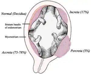 | Placenta accreta | 75–78% | The placenta attaches strongly to the myometrium, but does not penetrate it. This form of the condition accounts for around 75% of all cases. |
