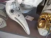 The costume is also associated with a commedia dell'arte character called Il Medico della Peste (lit.: The Plague Doctor), who wears a distinctive plague doctor's mask.[34] The Venetian mask was normally white, consisting of a hollow beak and round eye-holes covered with clear glass, and is one of the distinctive masks worn during the Carnival of Venice.[35]