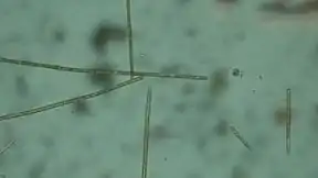 Planktothrix is a diverse genus of filamentous cyanobacteria observed to amass in algal blooms in water ecosystems across the globe. Like all Oscillatoriales, Planktothrix species have no heterocysts and no akinetes. Planktothrix are unique because they have trichomes and contain gas vacuoles unlike typical planktonic organisms.[1] Previously, some species of the taxon were grouped within the genus Oscillatoria, but recent work has defined Planktothrix as its own genus.[2] A tremendous body of work on Planktothrix ecology and physiology has been done by Anthony E. Walsby, and the 55.6 kb microcystin synthetase gene which gives these organisms the ability to synthesize toxins has been sequenced.[3] P. agardhii is an example of a type species of the genus.[4] P. agardhii and P. rubescens are commonly observed in lakes of the Northern Hemisphere where they are known producers of potent hepatotoxins called microcystins.[5]
