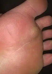 Plantar fascial fibromatosis, also known as Ledderhose's disease, Morbus Ledderhose, and plantar fibromatosis, is a relatively uncommon[2] non-malignant thickening of the feet's deep connective tissue, or fascia. In the beginning, where nodules start growing in the fascia of the foot the disease is minor. Over time walking becomes painful. The disease is named after Georg Ledderhose, a German surgeon who described the condition for the first time in 1894.[3][4] A similar disease is Dupuytren's disease, which affects the hand and causes bent hand or fingers.