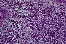 Histologically plasma cell gingivitis shows mainly plasma cells.[2] The differential diagnosis is with acute leukemia and multiple myeloma.[4] Hence, blood tests are often involved in ruling out other conditions.[3] A biopsy is usually taken, and allergy testing may also be used. The histopathologic appearance is characterized by diffuse, sub-epithelial plasma cell inflammatory infiltration into the connective tissue.[3] The epithelium shows spongiosis.[6] Some consider that plasmoacanthoma (solitary plasma cell tumor) is part of the same spectrum of disease as plasma cell cheilitis.[5]