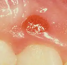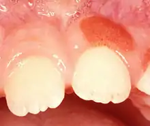 Plasma cell gingivitis[1][2] is a rare condition,[3] appearing as generalized erythema (redness) and edema (swelling) of the attached gingiva, occasionally accompanied by cheilitis (lip swelling) or glossitis (tongue swelling).[4] It is called plasma cell gingivitis where the gingiva (gums) are involved,[5] plasma cell cheilitis,[5] where the lips are involved, and other terms such as plasma cell orifacial mucositis,[5] or plasma cell gingivostomatitis where several sites in the mouth are involved. On the lips, the condition appears as sharply outlined, infiltrated, dark red plaque with a lacquer-like glazing of the surface of the involved oral area.[5]