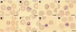 Malaria is traditionally diagnosed by examining Giemsa-stained blood films under a microscope; however, differentiating P. knowlesi from other Plasmodium species in this way is challenging due to their similar appearance.[11] P. knowlesi ring-stage parasites stained with Giemsa resemble P. falciparum ring stages, appearing as a circle with one or two dark dots of chromatin.[17] Older trophozoites appear more dispersed, forming a rectangular-shape spread across the host cell called a "band-form" that resembles the similar stage in P. malariae.[17] During this stage, dots sometimes appear across the host red blood cell, called "Sinton and Mulligans' stippling".[17] Schizonts appear, similarly to other Plasmodium species, as clusters of purple merozoites surrounding a central dark-colored pigment.[17]
