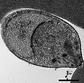 As an apicomplexan, P. knowlesi has several distinctive structures at its apical end that are specialized for invading host cells. These include the large bulbous rhoptries, smaller micronemes, and dispersed dense granules, each of which secretes effectors to enter and modify the host cell.[6][7] Like other apicomplexans, P. knowlesi also has two organelles of endosymbiotic origin: a single large mitochondrion and the apicoplast, both of which are involved in the parasite's metabolism.[8]