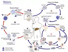 Like other Plasmodium parasites, P. knowlesi has a life cycle that requires it be passed back and forth between mammalian hosts and insect hosts. Primates are infected through the bite of an infected Anopheles mosquito which carries a parasite stage called the sporozoite in its salivary glands. Sporozoites follow the blood stream to the primate liver where they develop and replicate over five to six days before bursting, releasing thousands of daughter cells called merozoites into the blood (unlike the related P. vivax, P. knowlesi does not make latent hypnozoites in the liver).[1][2] The merozoites in the blood attach to and invade the primate's red blood cells. Inside the red blood cell, the parasite progresses through several morphologically distinguishable stages, called the ring stage, the trophozoite, and the schizont. The schizont-infected red blood cells eventually burst, releasing up to 16 new merozoites into the blood stream that infect new red blood cells and continue the cycle.[1][3] P. knowlesi completes this red blood cell cycle every 24 hours, making it uniquely rapid among primate-infecting Plasmodium species (which generally take 48 or 72 hours).[2] Occasionally, parasites that invade red blood cells instead enter a sexual cycle, developing over approximately 48 hours into distinct sexual forms called microgametocytes or macrogametocytes.[1][3] These gametocytes remain in the blood to be ingested by mosquitoes.[1][3]