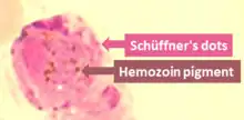 The microscopic appearance of P. ovale is very similar to that of P. vivax and if there are only a small number of parasites seen, it may be impossible to distinguish the two species on morphological grounds alone. There is no difference between the medical treatment of P. ovale and P. vivax, and therefore some laboratory diagnoses report "P. vivax/ovale", which is perfectly acceptable as treatment for the two is very similar. Schüffner's dots are seen on the surface of the parasitised red blood cell, but these are larger and darker than in P. vivax and are sometimes called James' dots or James' stippling. About twenty percent of the parasitised cells are oval in shape (hence the species name) and some of the oval cells also have fimbriated edges (the so-called "comet cell"). The mature schizonts of P. ovale never have more than twelve nuclei within them and this is the only reliable way of distinguishing between the two species.