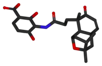 Platensimycin was first isolated from a strain of Streptomyces platensis by workers at Merck.[2][3] Screens of 250,000 natural product extracts (83,000 strains in three growth conditions) led to the identification of a potent and selective small molecule from a strain of Streptomyces platensis recovered from a soil sample collected in South Africa. The identification process was carried out using a two-plate system in which control organisms were compared to cells expressing FabF antisense RNA. This method uses a combination of target-based whole-cell and biochemical assays, allowing compounds to be detected at concentrations that would be too low to detect using whole cell assays. The molecule they identified, platensimycin (C24H27NO7, relative molecular mass 441.47), comprises two distinct structural elements connected by an amide bond. The Merck Group showed that platensimycin has potent, broad-spectrum Gram-positive activity in vitro and exhibits no cross-resistance to other key antibiotic-resistant bacteria including Methicillin-resistant Staphylococcus aureus(MRSA), vancomycin-intermediate S. aureus, vancomycin-resistant Enterococci, and linezolid-resistant and macrolide-resistant pathogens.