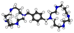 Plerixafor is a macrocyclic compound and a bicyclam derivative, the cyclam rings being linked at the amine nitrogen atoms by a 1,4-xylyl spacer.[2] It is a base; all eight nitrogen atoms accept protons readily. The two macrocyclic rings form chelate complexes with bivalent metal ions, especially zinc, copper and nickel, as well as cobalt and rhodium. The biologically active form of plerixafor is its zinc complex.[10]