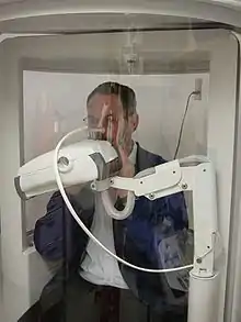 With cabinless plethysmography, the patient is seated next to a desktop testing device and inserts the mouthpiece into his/her mouth. The patient takes a series of normal tidal breaths for approximately one minute. During this tidal breathing, a series of rapid interruptions occurs, with a shutter opening and closing, measuring pressure and volume. [3] Lung volume measurements taken with cabinless plethysmography are considered equivalent to body plethysmography.[4]