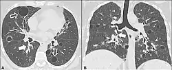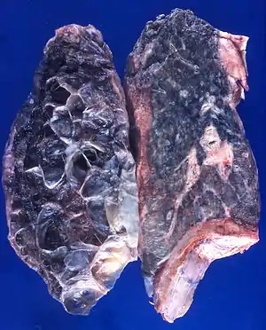 A lung cyst, or pulmonary cyst, encloses a small volume of air, and has a wall thickness of up to 4 mm.[3] A minimum wall thickness of 1 mm has been suggested,[3] but thin-walled pockets may be included in the definition as well.[4] Pulmonary cysts are not associated with either smoking or emphysema.[5]