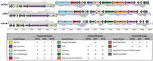 The double stranded DNA genome is linear, around 40-42kb in length,[2] and encodes ~55 genes. The guanine + cytosine content is ~50%. It has terminally redundant sequences and is nonpermuted. By weight, the genome constitutes ~50% of the viron. The genome encodes 9 structural proteins, an adenylated transferase B type DNA polymerase and an RNA polymerase. Three internal proteins constitute the polymerase complex. Two classes of genes are recognized (early and late). This classification is based on the timing of transcription that is temporally regulated. Genes with related functions are clustered together. Genome replication is bidirectional.