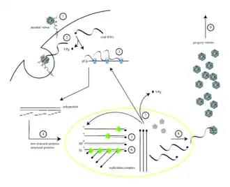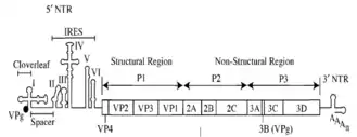 - VPg (3B), a small protein that binds viral RNA and is necessary for synthesis of viral positive and negative strand RNA