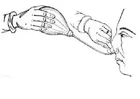 ![]() The Politzer maneuver, original illustration of 1863 | |