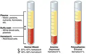 Polycythemia (also known as polycythaemia) is a laboratory finding in which the hematocrit (the volume percentage of red blood cells in the blood) and/or hemoglobin concentration are increased in the blood. Polycythemia is sometimes called erythrocytosis, and there is significant overlap in the two findings, but the terms are not the same: polycythemia describes any increase in hematocrit and/or hemoglobin, while erythrocytosis describes an increase specifically in the number of red blood cells in the blood.
