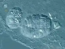 The most distinctive trait of this genus is the formation of multinucleated pseudocolonies that consist of an even number of zooids. Each zooid has a pair of flagella (transverse and longitudinal flagella) and has its own transverse groove, cingulum, but zooid longitudinal furrows, sulci, are fused.[8] Transverse flagellum has the lateral projections, mastigonemes, and striated strand common to other dinoflagellates.[9] Often Polykrikos have half the number of nuclei than zooids, and each pair of zooids shares a nucleus. Within the group there is some variation in which organelles are presented, but trichocysts, nematocysts, taeniocysts, mucocysts and plastids have been observed from different members within the taxon.[8]