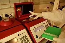 - Convective PCR: a pseudo-isothermal way of performing PCR. Instead of repeatedly heating and cooling the PCR mixture, the solution is subjected to a thermal gradient. The resulting thermal instability driven convective flow automatically shuffles the PCR reagents from the hot and cold regions repeatedly enabling PCR.[51] Parameters such as thermal boundary conditions and geometry of the PCR enclosure can be optimized to yield robust and rapid PCR by harnessing the emergence of chaotic flow fields.[52] Such convective flow PCR setup significantly reduces device power requirement and operation time.