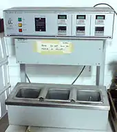 The reaction is commonly carried out in a volume of 10–200 μL in small reaction tubes (0.2–0.5 mL volumes) in a thermal cycler. The thermal cycler heats and cools the reaction tubes to achieve the temperatures required at each step of the reaction (see below). Many modern thermal cyclers make use of the Peltier effect, which permits both heating and cooling of the block holding the PCR tubes simply by reversing the electric current. Thin-walled reaction tubes permit favorable thermal conductivity to allow for rapid thermal equilibrium. Most thermal cyclers have heated lids to prevent condensation at the top of the reaction tube. Older thermal cyclers lacking a heated lid require a layer of oil on top of the reaction mixture or a ball of wax inside the tube.