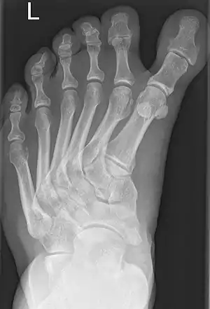 Polymetatarsia is a rare congenital malformation which is characterized by the presence of 6 or more metatarsal bones in the same foot. It is most commonly seen alongside polydactyly,[1] and it often appears between the fourth and fifth metatarsals or beside the fifth metatarsal.