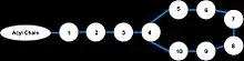 Polymyxins are a group of cyclic non-ribosomal polypeptide (NRPs) which are biosynthesized by bacteria belonging to the genus Bacillus, more specifically the subgenus Paenibacillus. Polymyxins consist of 10 amino acid residues, six of which are L-α,γ-diaminobutyric acid (L-DAB). The DAB residues cause polymyxins to have multiple positively charged groups at physiological pH. Seven amino acid residues form the main cyclic component, while the other three extend from one of the cyclic residues as a linear chain terminating in either 6-methyloctanoic acid or 6-methylheptanoic acid at the N-terminus. During cyclization, residue 10 is bound to the bridging residue 4.[9] The amino acid residues and DAB monomers are generally in the L (levo) configuration, however certain strains such as P. polymyxa PKB1 have been observed to incorporate DAB with the D (dextro) configuration at position 3 producing variations of polymyxin B.[10]