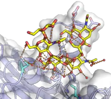Murine polyomavirus VP1 in complex with the GT1a glycan. GT1a is shown in yellow and the VP1 monomer with a white surface and a blue protein backbone. A complex network of hydrogen bonds, many water-mediated, is shown at the binding surface by orange lines, with participating protein residues shown as sticks. Mutations of the two residues shown in cyan at the bottom of the figure can significantly affect pathogenicity. From PDB: 5CPW.[16]
