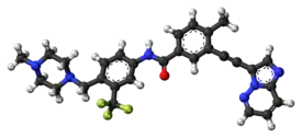 Ponatinib, sold under the brand name Iclusig, is a medication developed by ARIAD Pharmaceuticals for the treatment of chronic myeloid leukemia (CML) and Philadelphia chromosome–positive (Ph+) acute lymphoblastic leukemia (ALL). It is a multi-targeted tyrosine-kinase inhibitor.[3] Some forms of CML, those that have the T315I mutation, are resistant to current therapies such as imatinib. Ponatinib has been designed to be effective against these types of tumors.[4]