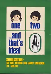 The first phase started with the launch of the Singapore Family Planning and Population Board in 1966 to aggressively promote family planning after Singapore faced "post-war food and housing shortages".[1] SFPPB targeted low-socioeconomic status individuals, particularly females, and worked to encourage contraceptive use, such as condoms and birth control.[1] The SFPPB advocated for small families, establishing the "Stop-at-Two" program, which pushed for small two-children families and promoted sterilisation in order to have population control. SFPPB also opened more clinics to better the health and welfare of families.[1]