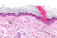 Micrograph of a case of porokeratosis showing a characteristic cornoid lamella (dark pink/red structure in the right/upper portion of the image). H&E stain.