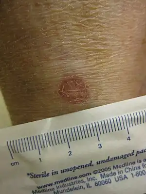 | A porokeratosis lesion in a patient with disseminated superficial actinic porokeratosis. | |