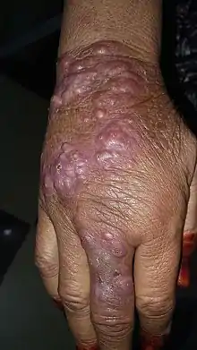Post-kala-azar dermal leishmaniasis (also known as "Post-kala-azar dermatosis") found mainly on the face, arms, and upper part of the trunk. It occurs years (in the Indian variation) or a few months (in the African strain) after the successful treatment of visceral leishmaniasis.