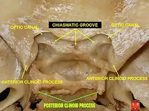 Sphenoid bone. Superior view. (Posterior clinoid process labeled at upper left.)