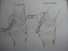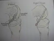 In this position, the PCL functions to prevent movement of the tibia in the posterior direction [4][13] and to prevent the tilting or shifting of the patella.[14] However, the respective laxity of the two sections makes the PCL susceptible to injury during hyperflexion, hyperextension,[15] and in a mechanism known as a dashboard injury.[6] Because ligaments are viscoelastic[16]) they can handle higher amounts of stress only when the load is increased slowly.[17] When hyperflexion and hyperextension occur suddenly in combination with this viscoelastic behavior, the PCL deforms or tears.[15] In the third and most common mechanism, the dashboard injury mechanism, the knee experiences impact in a posterior direction during knee flexion toward the space above the tibia.[7][15] These mechanisms occur in excessive external tibial rotation and during falls that induce a combination of extension and adduction of the tibia, which is referred to as varus-extension stress,[7] or that occur while the knee is flexed.[15]