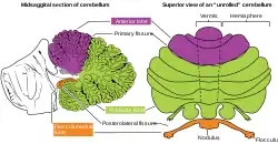The posterior lobe of cerebellum or neocerebellum, is the portion of the cerebellum below the primary fissure. The posterior lobe is much larger than anterior lobe. The anterior lobe is separated from the posterior lobe by the primary fissure, and the posterolateral fissure separates flocculonodular lobe from the posterior lobe.[1]