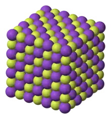 KF crystallizes in the cubic NaCl crystal structure. The lattice parameter at room temperature is 0.266 nm.[4]