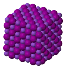 Potassium iodide is an ionic compound which is made of the following ions: K+I. It crystallises in the sodium chloride structure. It is produced industrially by treating KOH with iodine.[31]