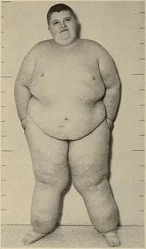 PWS is frequently associated with a constant insatiable appetite, which persists no matter how much the patient eats, often resulting in morbid obesity. Caregivers need to strictly limit the patients' access to food, usually by installing locks on refrigerators and on all closets and cabinets where food is stored.[20] It is the most common genetic cause of morbid obesity in children.[21] Currently, no consensus exists as to the cause for this symptom, although genetic abnormalities in chromosome 15 disrupt the normal functioning of the hypothalamus.[15] Given that the hypothalamic arcuate nucleus regulates many basic processes, including appetite, a link may well exist. In the hypothalamus, nerve cells that produce oxytocin, a hormone thought to contribute to satiety, are believed to be abnormal in people with PWS.[22]